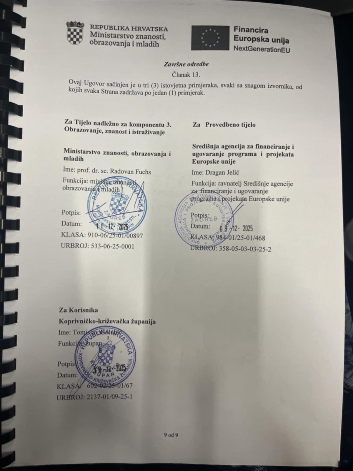 Ugovor je potpisan u prisustvu predsjednika Vlade Republike Hrvatske, g. Andreja Plenkovića i Ministra znanosti, obrazovanja i mladih, g. Radovana Fuchsa, a sredstva su osigurana iz Nacionalnog plana oporavka i otpornosti.